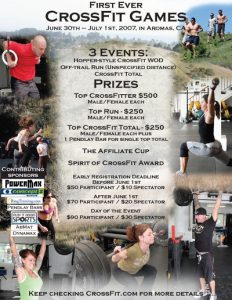 En 2007 se disputa la primera competición oficial, conocida como Crossfit Games®, cuyo objetivo es el determinar quién es el “Fittest on Earth”, o la persona más en forma del planeta. Compiten 40 hombres y 20 mujeres en el rancho Los Aromas de California. En los años sucesivos se producen grandes avances que harán crecer el movimiento, como la participación en la fase clasificatoria de la competición de cientos de miles de personas en 2016, la difusión gratuita y por live streaming de la misma, o la publicación online de los resultados de todos los practicantes de Crossfit del mundo.